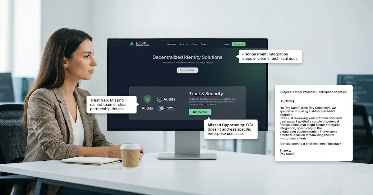 An AI teardown before first email to crypto projects gives you a stronger opening move than a vague audit offer. Instead of asking for time before you prove relevance, you use public evidence to show that you already understand the prospect's homepage, docs, trust pages, and conversion friction.
