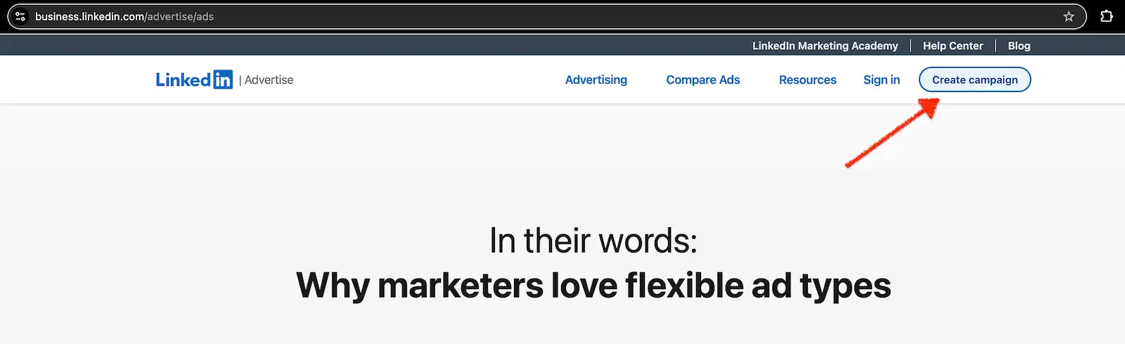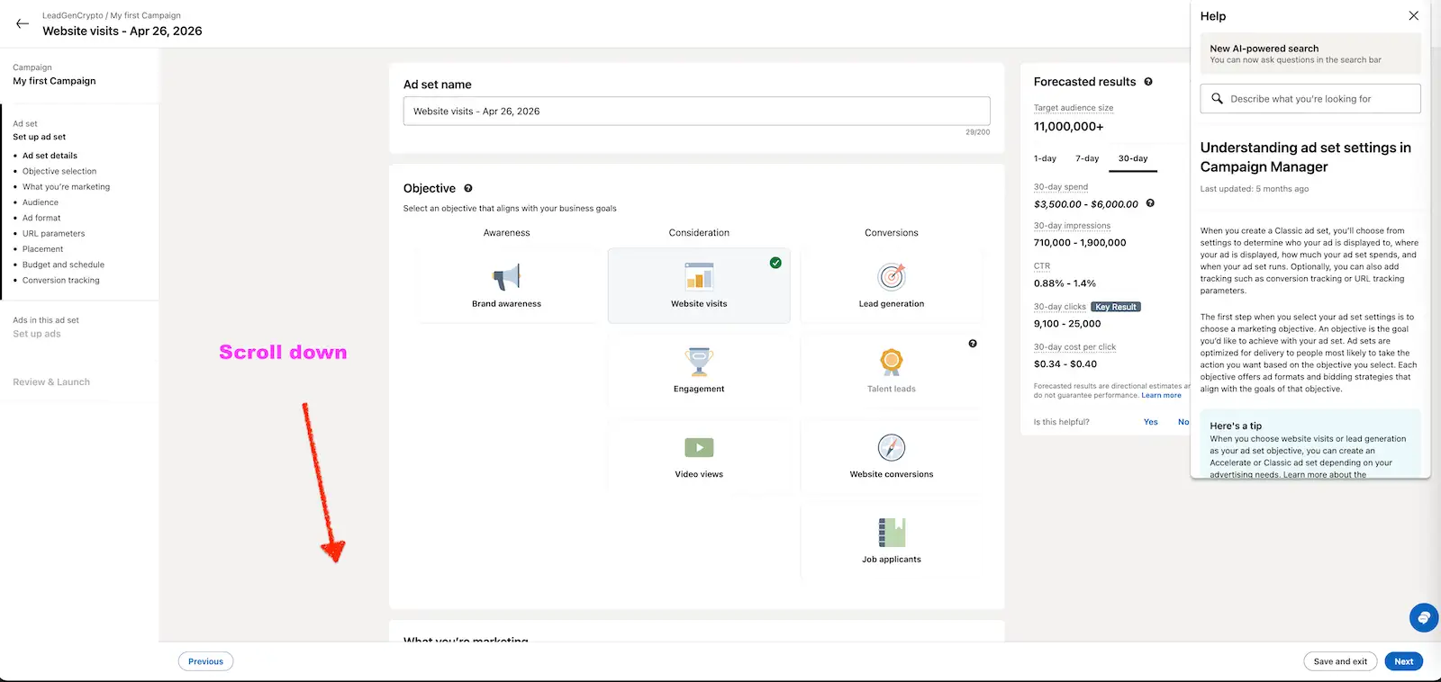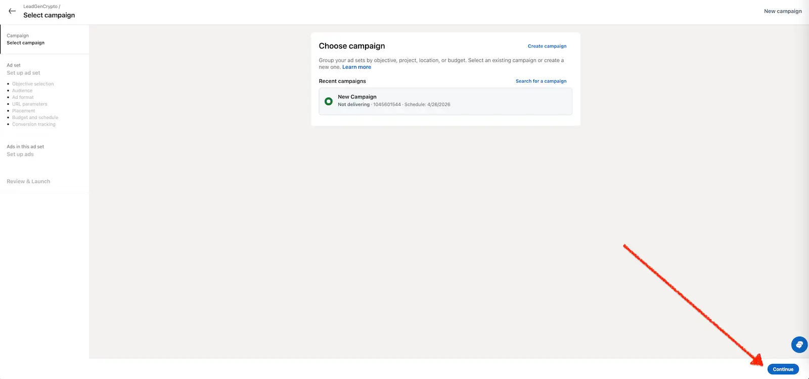 Start from LinkedIn Ads or Campaign Manager and create a campaign. Choose an objective that matches your next action. For most service providers with a landing page, Website visits is the simplest first test. Lead generation can work when you want a LinkedIn form. Website conversions is better after tracking is configured and you have enough conversion events to optimize responsibly.