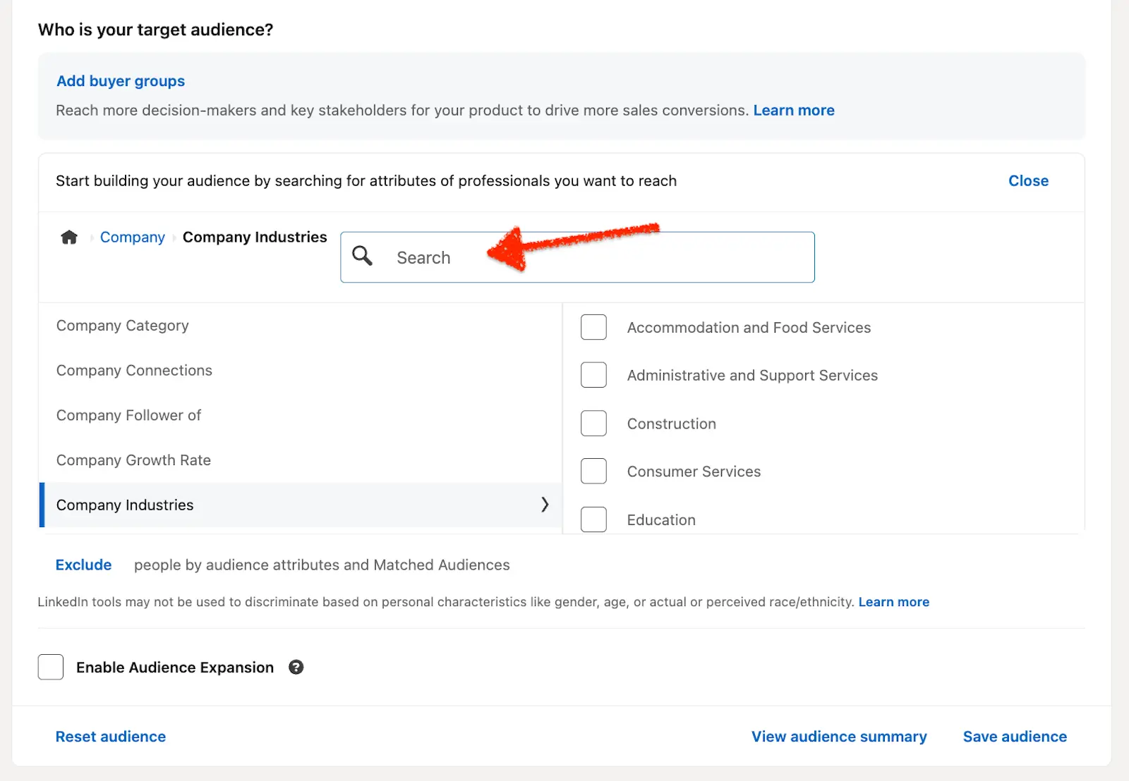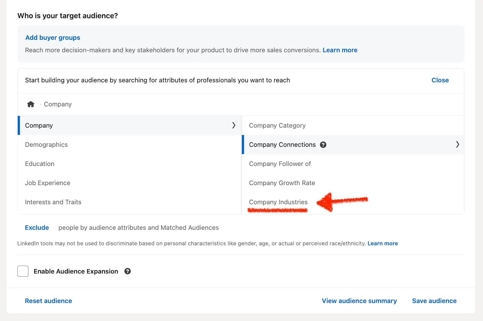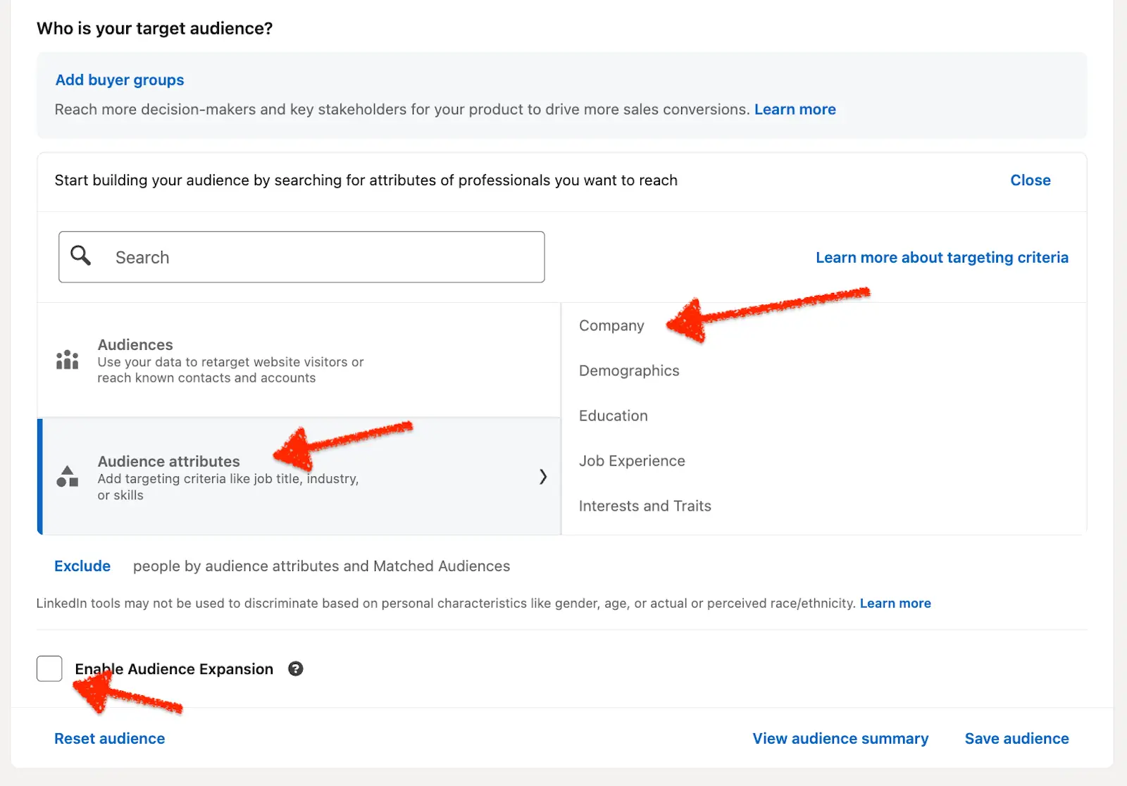 Then open Audience attributes. Keep Audience Expansion off during the first test. Expansion can be useful later, but it makes your baseline harder to interpret because LinkedIn may move beyond the exact audience you intended.