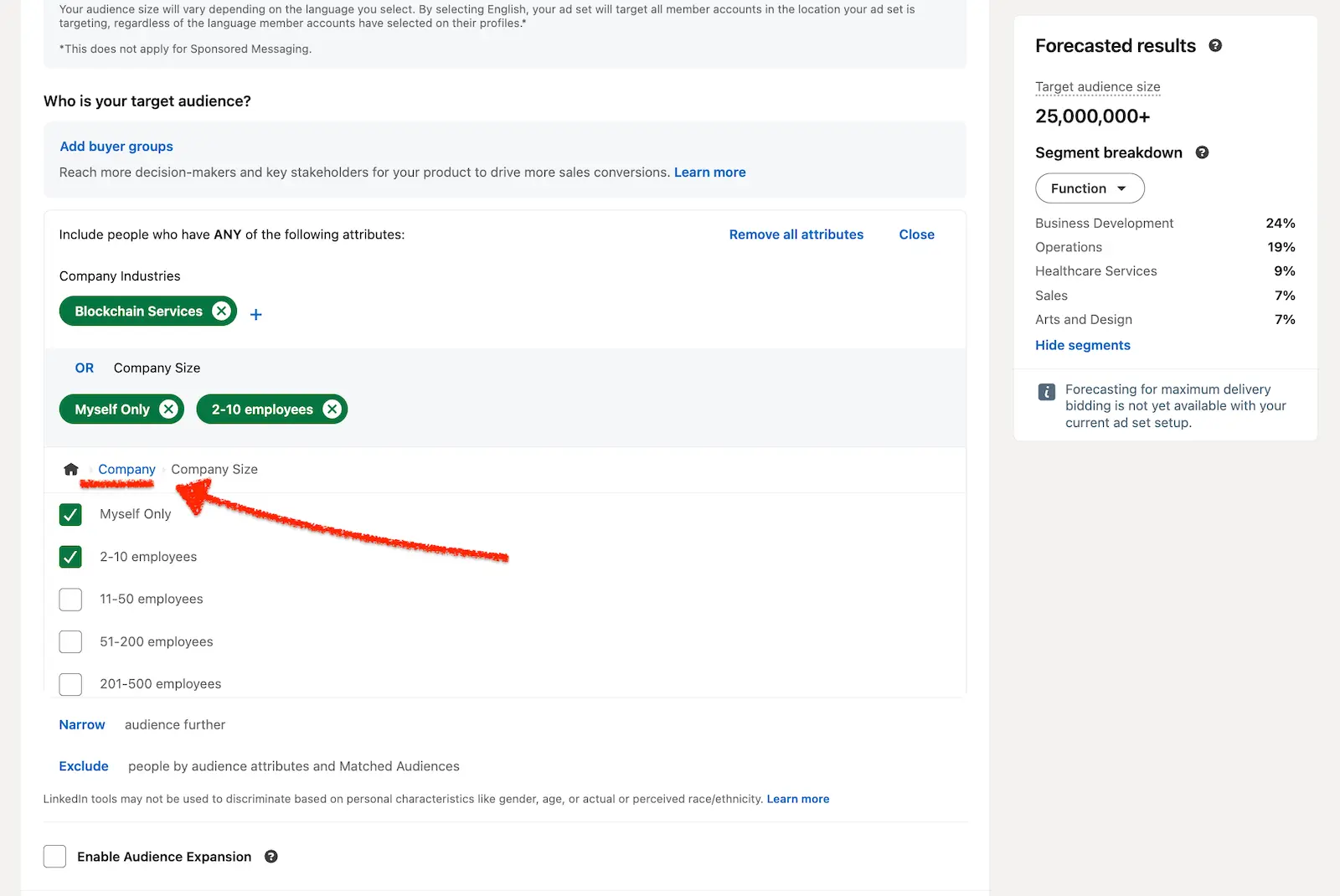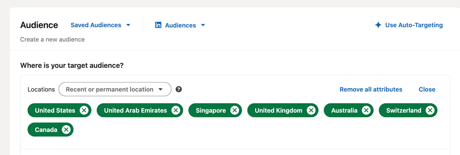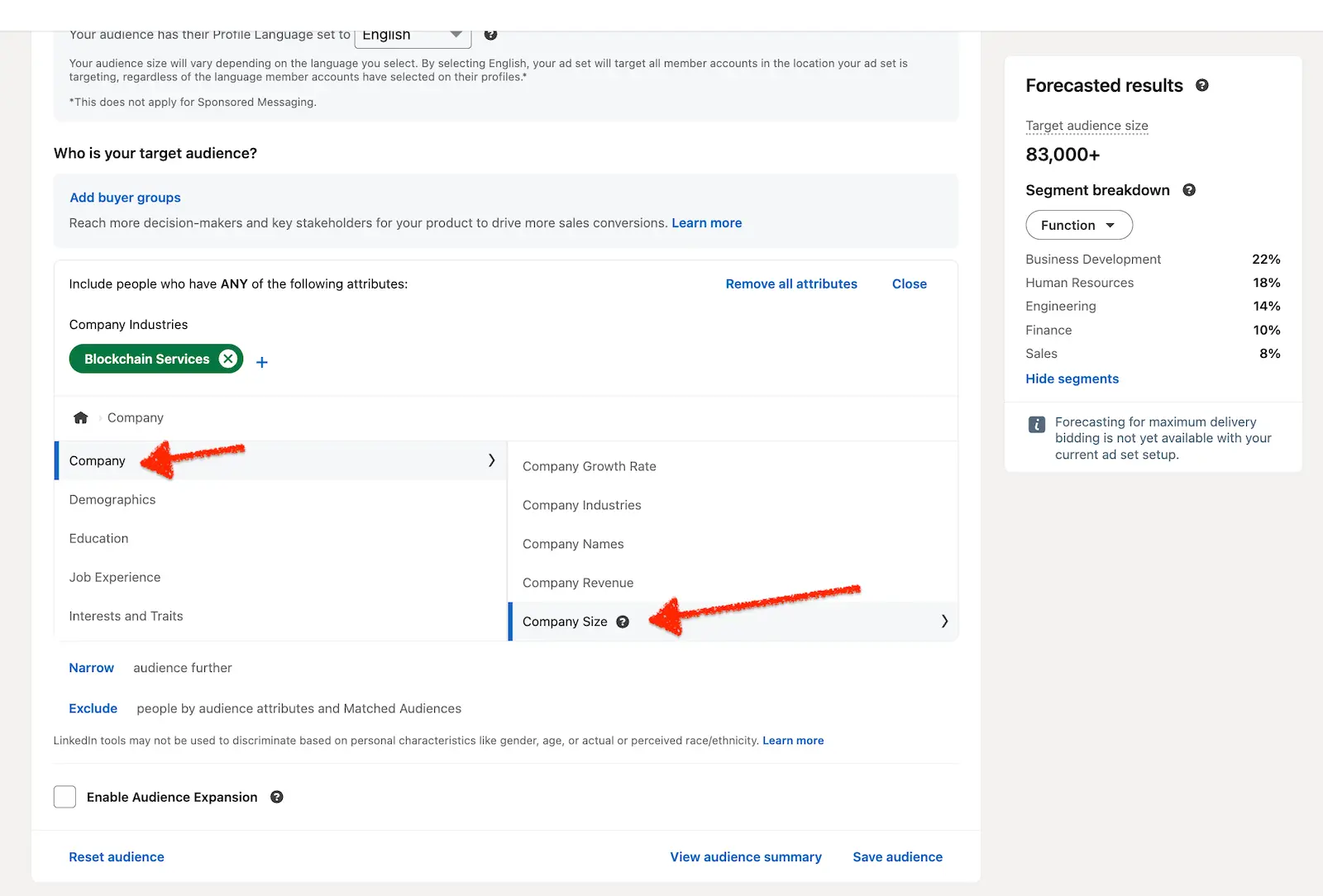 Then open Audience attributes. Keep Audience Expansion off during the first test. Expansion can be useful later, but it makes your baseline harder to interpret because LinkedIn may move beyond the exact audience you intended.