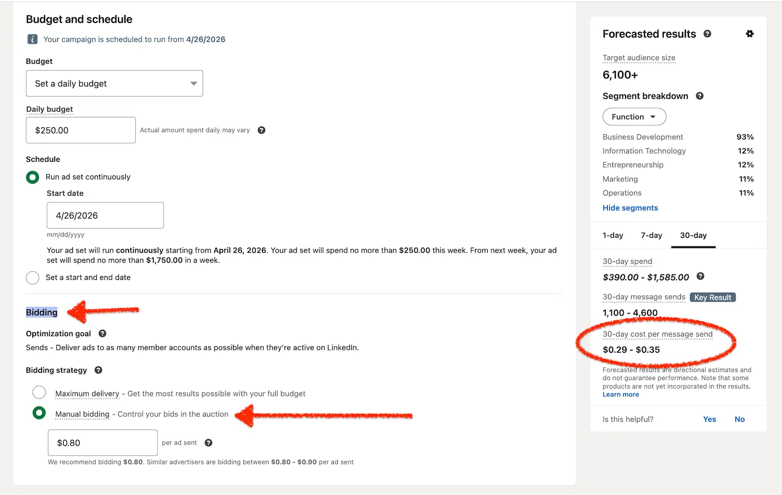 Use the forecasted $0.29 to $0.35 as the planning estimate for average cost per sent message. The $0.80 value is the manual bid input. Actual Cost per Send after launch can differ.