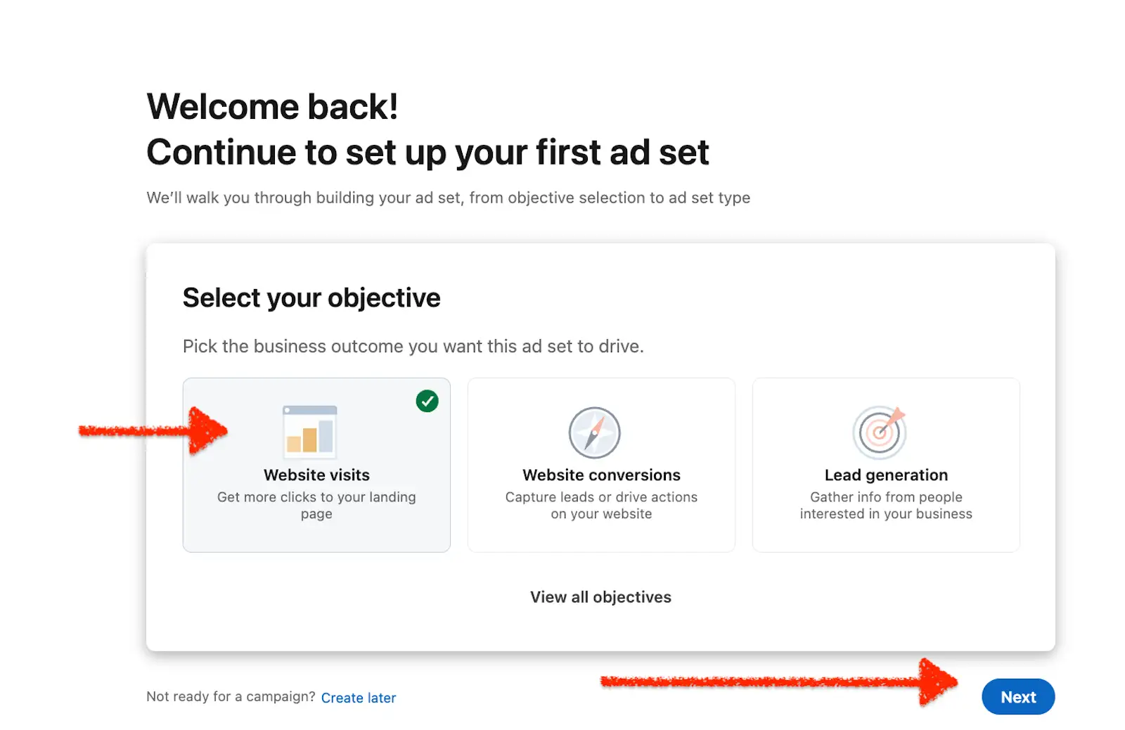 | Objective | Website visits, Lead generation, or Website conversions | Match the next action to your funnel maturity |