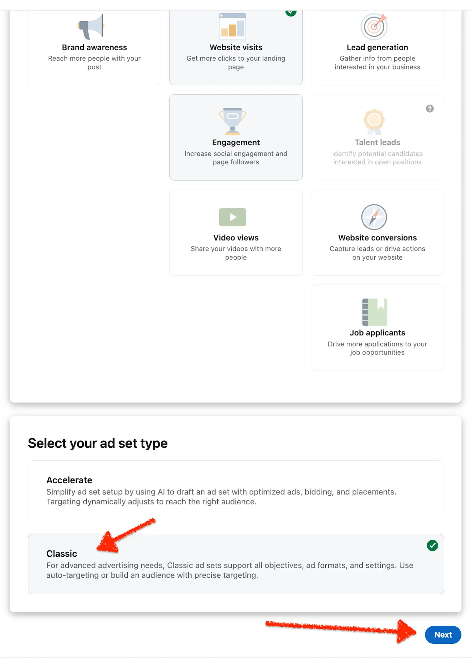 | Ad set type | Classic | Keeps targeting, bidding, and format choices under control |