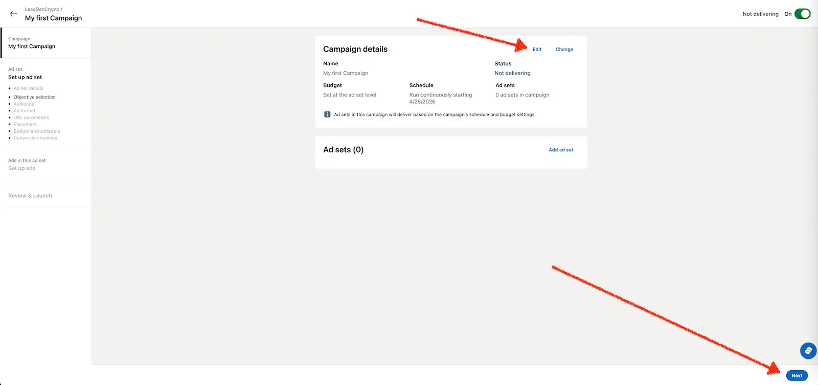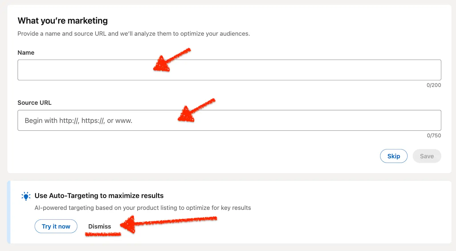 When the setup screen asks what you are marketing, use a plain B2B service name and a relevant source URL. Avoid token-like naming, hype wording, or anything that sounds like investment promotion. If Campaign Manager offers Auto-Targeting, dismiss it for the first test so your baseline stays readable.