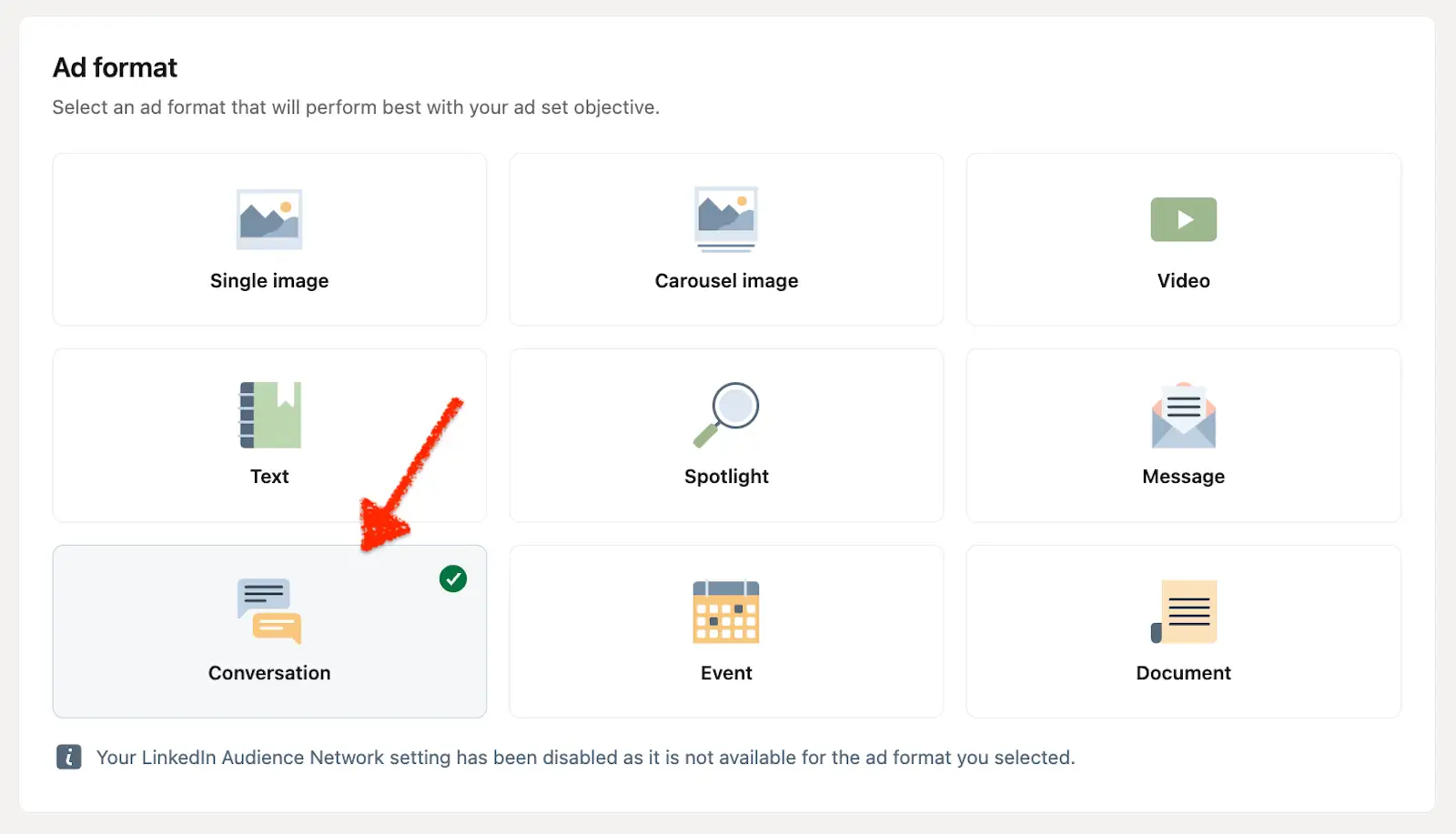 | Ad format | Message Ad or Conversation Ad | Use inbox formats for inbox delivery |
